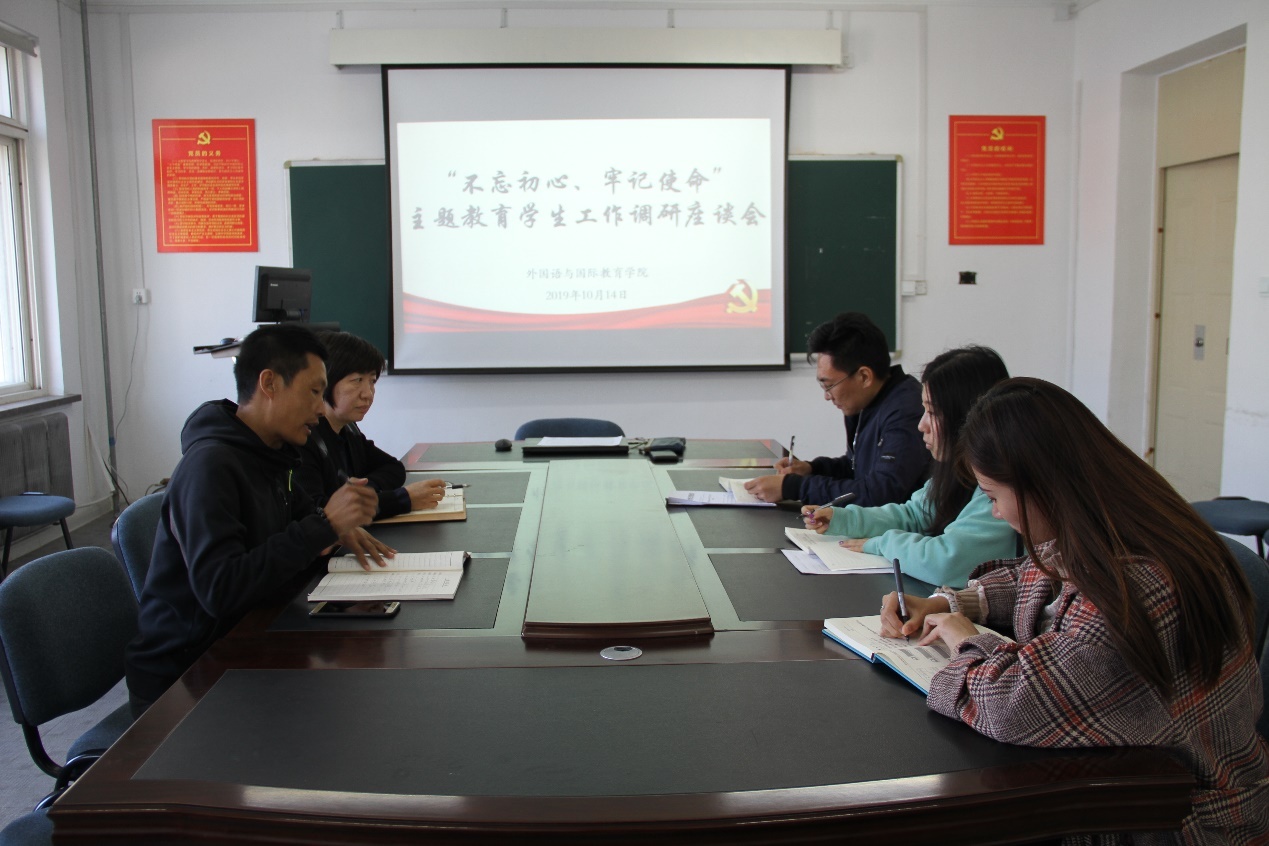 1014日下午,六色网 在党员活动室召开了“不忘初心、牢记使命”主题教育学生工作调研座谈会。学院党总支书记邓艺、副书记孙祥山、团委书记周宇颂、辅导员田源、孟美斯参会。会议由孙祥山主持。