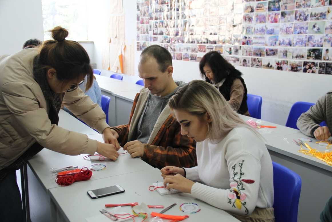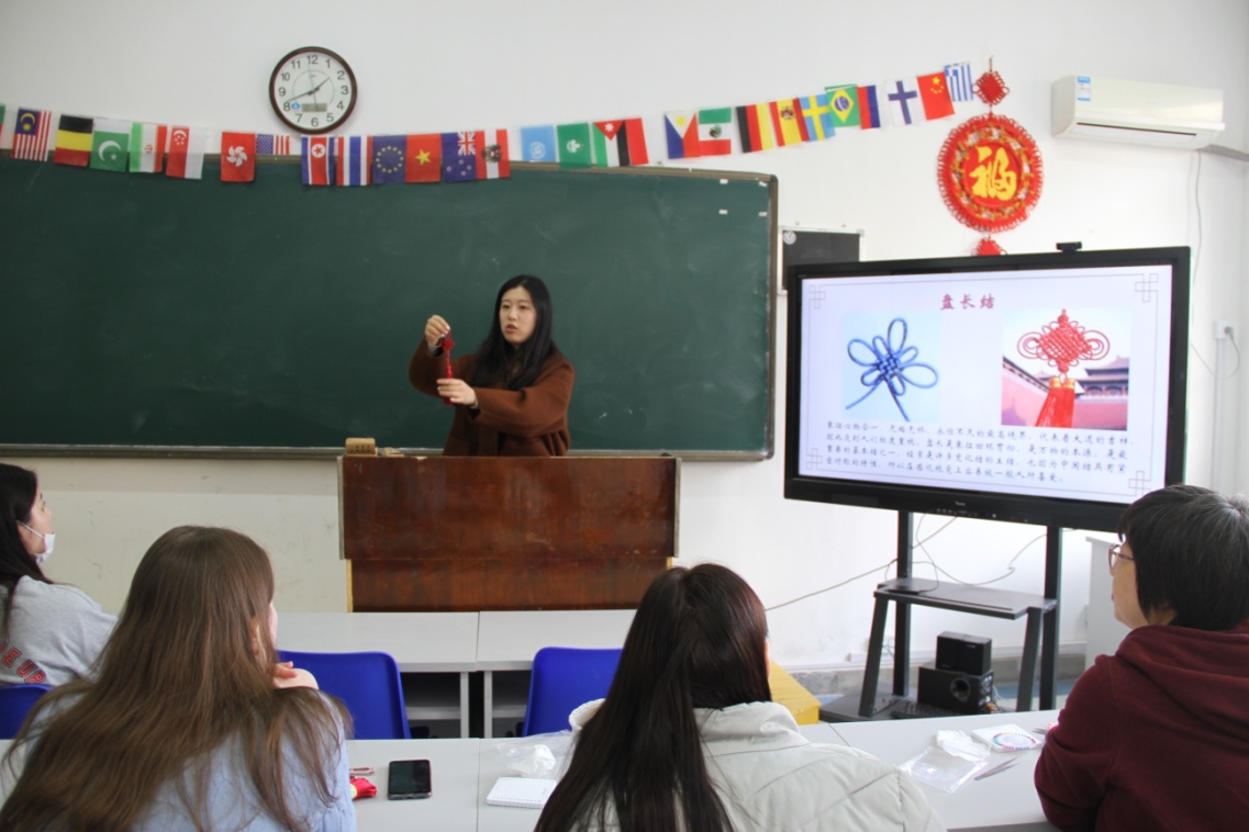 首先,田源以《中国传统编织文化——中国结》为题向留学生们介绍了中国结的发展历史、文化内涵、中国结的应用和种类。随后,在实践环节中,田源和其他几位指导教师亲自给留学生们示范中国结的编织技术及步骤,留学生们跃跃欲试,纷纷拿起手中的线绳全神贯注地穿线、结节。起初有一部分留学生并不能很好地掌握系结的方法,但是大家兴趣不减,互相讨教,学习气氛十分高涨。最后每位留学生都编出了一件漂亮的中国结作品。