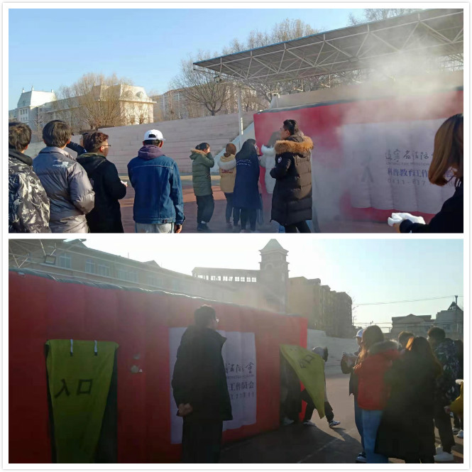 本次活动邀请辽宁省消防安全科普教育委员会冯有刚教官作专题培训。他从火灾形成的原因、如何正确逃生、消防设备的使用等方面进行讲解,教会学生如何使用干粉性灭火器、防烟防毒口罩等,同时结合相关案例,强调学生宿舍消防安全的重要性,并就如何进一步加强宿舍安全管理工作进行了指导。随后同学们进行了消防逃生演练,在使用逃生帐篷模拟火灾现场,学生们采取学习到的逃生技巧有条不紊地进行逃生撤离。