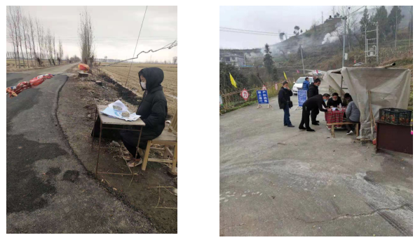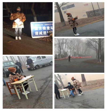 2017级程茎同学在吉林省吉林市八道河子镇参与志愿服务,在社区分界口地区,设置隔离带,对过往车辆上的人员进行体温测量,帮助工作人员统计外来人员名单,呼吁大家少出门,不聚集,禁止一切群体活动。