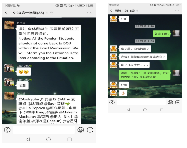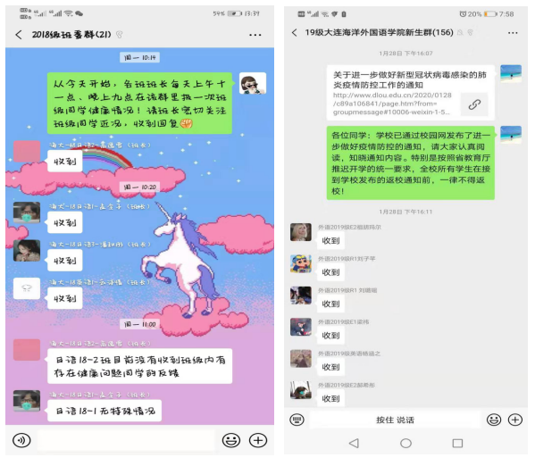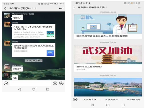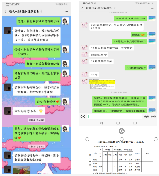 疫情期间,按照学校有关要求,学院严格执行疫情排查日报告、零报告制度,学院学生工作队伍对近期有湖北旅游史及湖北接触史的同学、驻连学生信息等,进行“一对一”了解,坚持“一日一报”,让学生每日进行健康打卡,并做好“疫情控制工作日志”, 认真统计上报各类学生数据。