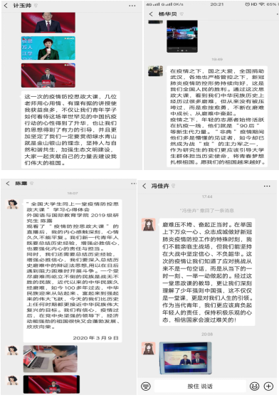 我院全体研究生听完课后纷纷发表心得,认为这堂思政大课具有政治高度、思想深度和情感温度,四位主讲人的课程有滋有味,思维上受启发、思想上受洗礼、灵魂上有启迪,对疫情防控战疫中的中国方案、中国智慧和中国速度感到震撼和自豪,更加坚定了中国特色社会主义的“四个自信”。