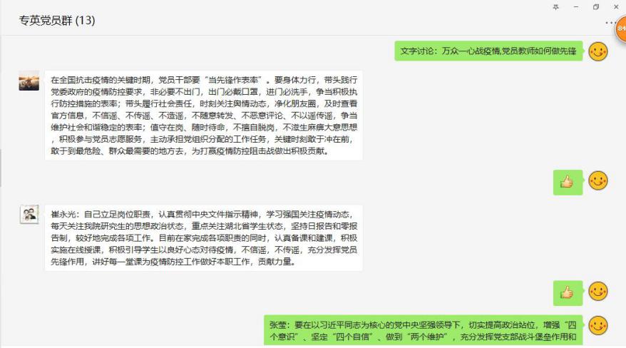 各支部以“万众一心战疫情,党员教师如何做先锋”为主题进行了热烈讨论。与会同志纷纷表示,作为党员教师,肩负着弘扬主旋律、传播正能量的神圣职责,要在以习近平同志为核心的党中央坚强领导下,切实提高政治站位,增强“四个意识”、坚定“四个自信”、做到“两个维护”,充分发挥党支部战斗堡垒作用和党员先锋模范作用,把工作继续做实做细做到位;要在打赢疫情防控阻击战的严峻考验面前,坚守立德树人的初心,勇担教书育人的使命,不当旁观者,主动担当作为,坚定必胜信心,众志成城攻坚;要一手抓疫情防控,一手抓科研教学,努力做好网络教学的各项准备工作,确保两手抓两不误,坚决打赢这场没有硝烟的战争。