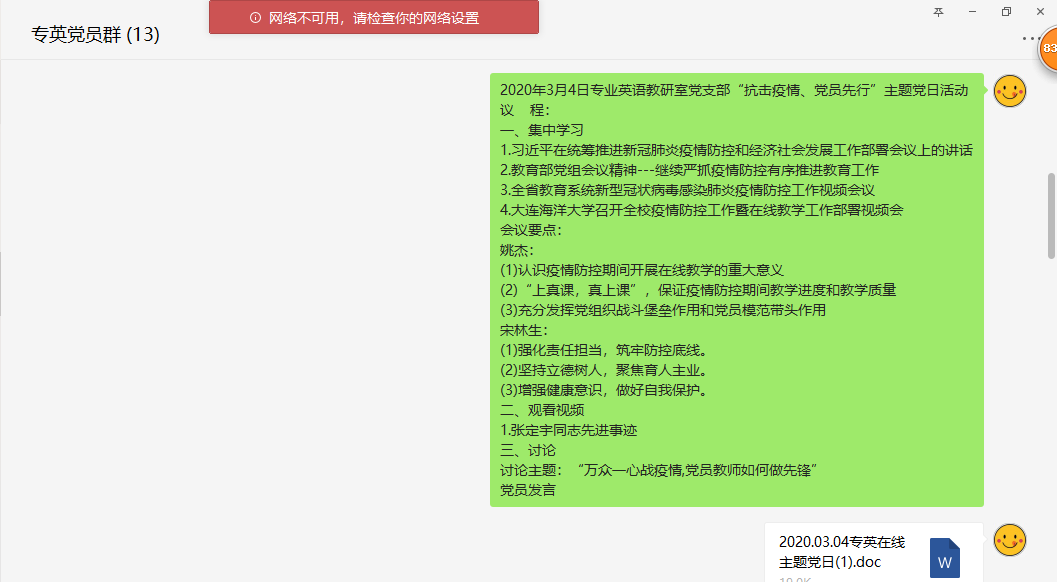 3月4日,六色网 党总支所属教工党支部通过“学习强国”视频会议、微信群视频会议、腾讯会议等线上功能,开展了“抗击疫情,党员先行”主题党日活动。活动由各支部书记主持,全体党员参加。