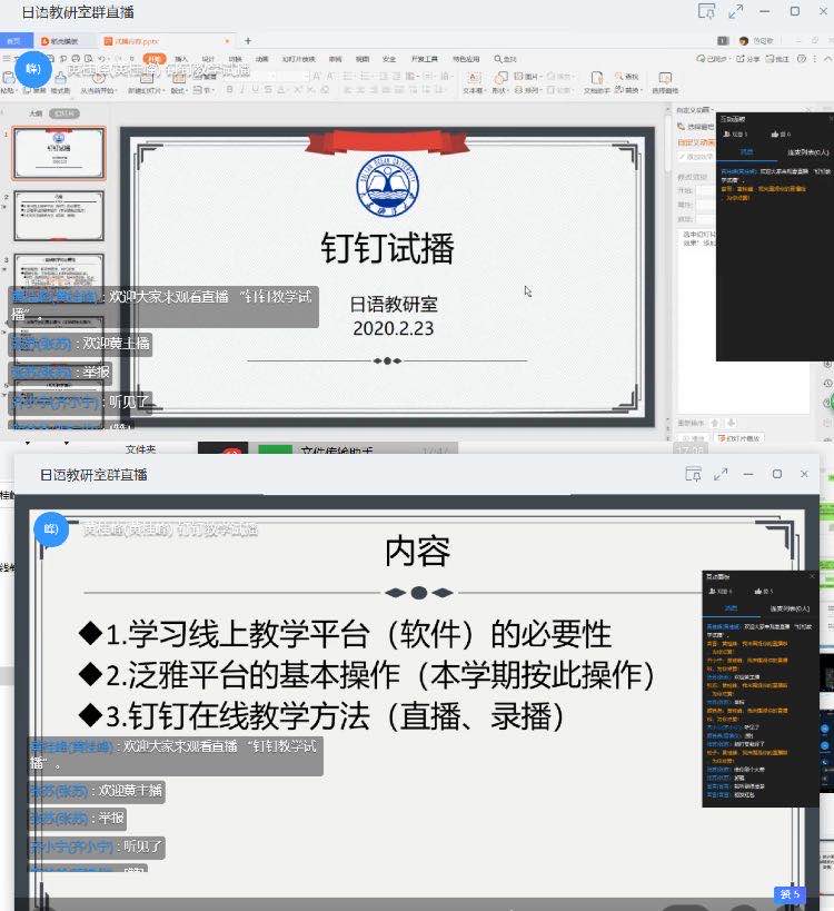 二、试用授课平台。为了选择适合教学工作的网络平台,保证线上教学工作如期进行,专业日语教研室建立了钉钉平台的“虚拟教研室”,教研室主任黄桂峰老师先后做了两场在线教学示范直播。目前授课教师已基本掌握泛雅平台的课程建设流程和钉钉直播/录播课的操作方法,初步形成了“超星泛雅线上学习平台+互动直播软件(钉钉/QQ/微信)”的在线教学模式。专业英语教研室通过视频会议,组织老师集体线上备课。大学英语教研室成立不同课程的线上授课备课小组,并以钉钉、腾讯课堂、腾讯会议等多个平台,作为学校平台的必要补充。对外汉语教研室积极与在国外的留学生沟通交流新学期改变教学模式的情况,为线上教学做好充分准备。