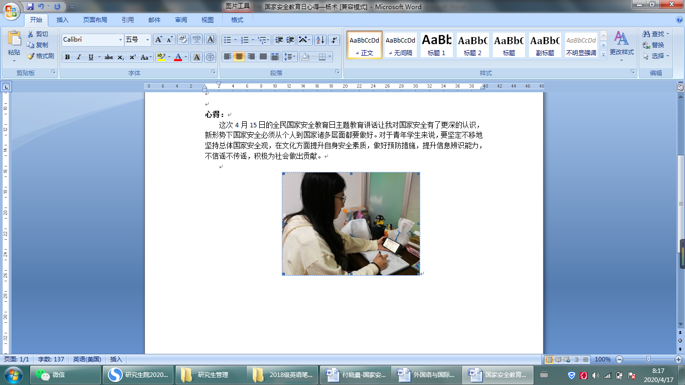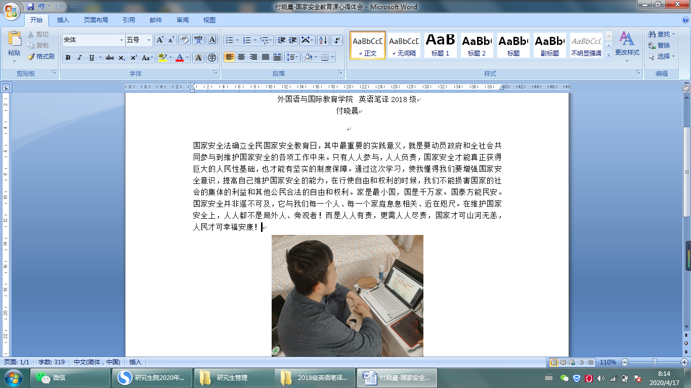 415日至16日,按照教育部、省教育厅有关要求,六色网 组织全体41名专硕研究生通过在线观看“千万学生同上一堂国家安全教育课”和参加“国家安全知识在线问答”的方式,开展了2020年全民国家安全教育日活动,并撰写了观看心得。