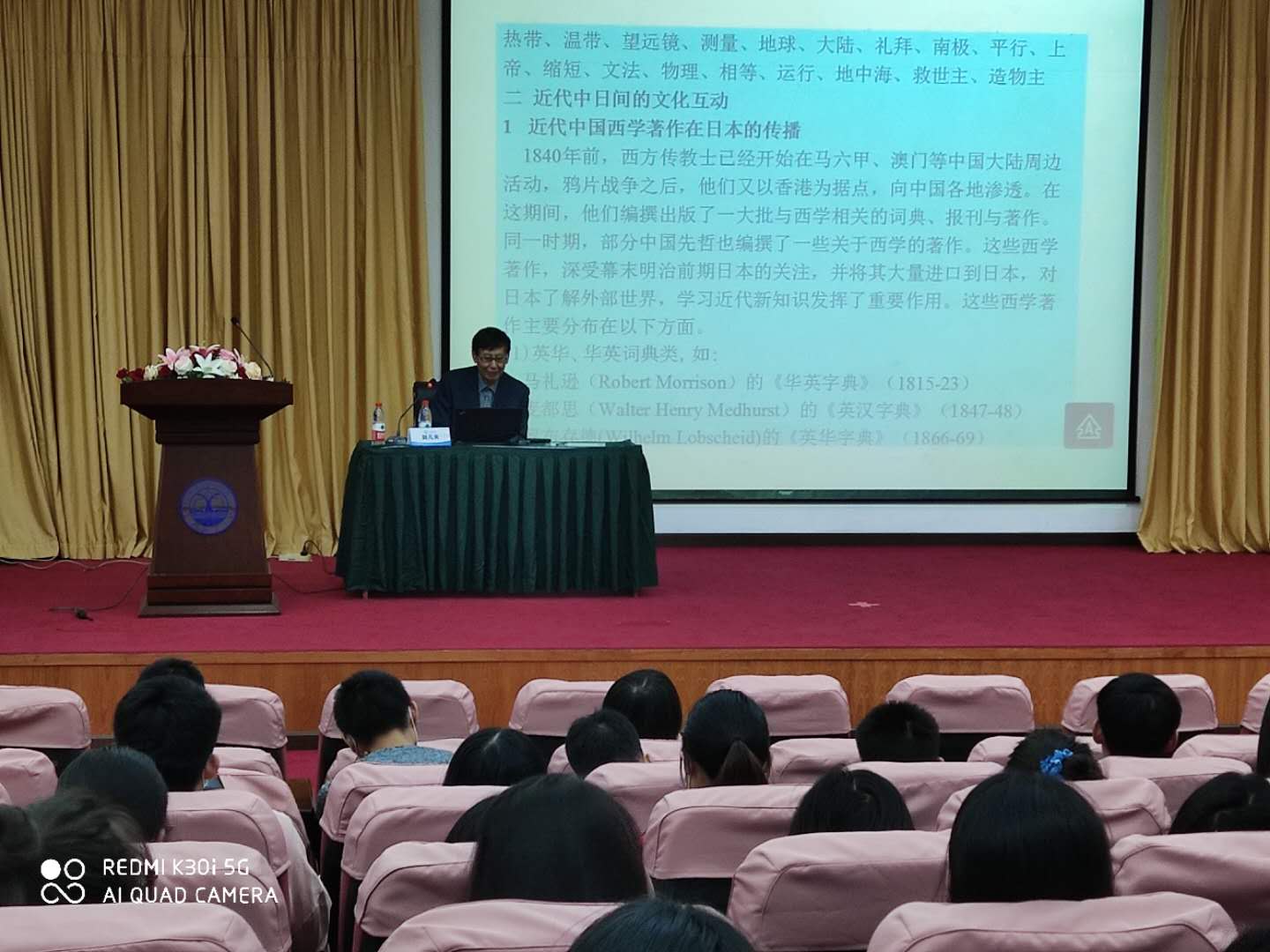 刘凡夫教授以“中日文化互动与近代两国新词语的生成”为题,通过丰富的历史文献和词典语料详细介绍分析了近代中日文化交流以及文化互动过程中,汉字新词语在两国间的流动,以及新词语进入两国语言后消化和吸收的过程,指出汉字新词语的互动丰富了中日两国的词汇,客观上也促进了日汉词汇体系的完善与发展。关于中日文化交流,刘教授重点介绍了近代之前和近代从中国传入日本并对其文化产生深远影响的文学著作、词典的出版物。在互动环节,学生们积极提问,提问内容包括日本吸收中国文化的方式特点、汉日同形异义词的产生及其对译中需要注意等问题,刘教授逐一细心回答了学生的提问。本场讲座使在座的师生对中日语言接触与文化互动的相互作用有了更加深层次的了解,为大家更好地认识汉语言文字的对外传播与影响提供了很好的学习机会。
