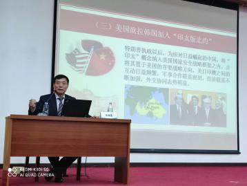 在互动环节,师生们围绕抗美援朝、美国对中国的牵制等问题积极提问,姜教授耐心细致地回答了提问。他强调,2013年习近平主席首次提出构建人类命运共同体的倡议,充分体现了中国致力于为世界和平与发展做出更大贡献的崇高目标;文在寅总统也先后提出打造韩国与东盟“和平共同体”、中俄韩朝蒙日美“东北亚铁路共同体”以及朝鲜半岛南北“和平共同体”、“经济共同体”和“生命共同体”的设想,这为中韩两国合作共赢打下了坚实基础。本场讲座为师生们更好地认识东北亚国际关系的影响因素提供了很好的学习机会,使在座师生对中韩关系的重要性与复杂性有了深层次的了解。