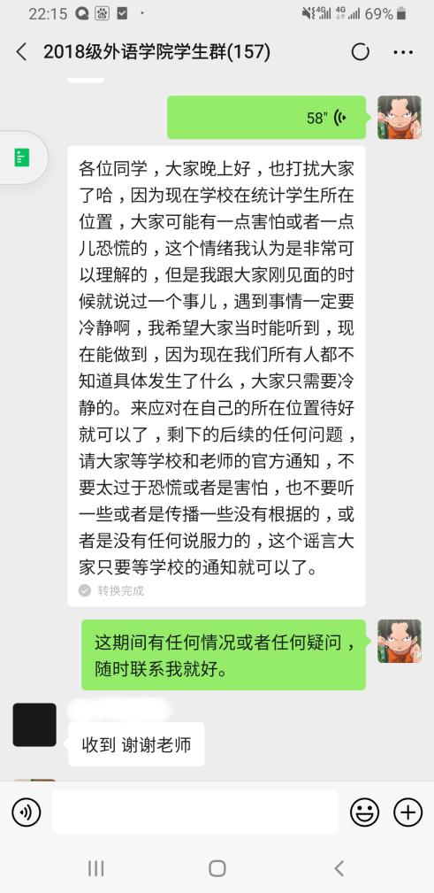 他每天总是很早就开始工作,一忙就是一整天,直至深夜也不能休息。他防护服内的衣服经常被汗水全部浸透,有时更是连饭也顾不上吃。但他却说,在这样的特殊时期,学生难免会觉得委屈、感到焦虑,随时可能会发生各种意想不到的问题。因此,只有让学生安心,他自己才能放心。他要让学生每时每刻都能感到他的存在,让学生知道,老师和他们站在一起。只要能让学生安心,他就永远不会感到疲惫。