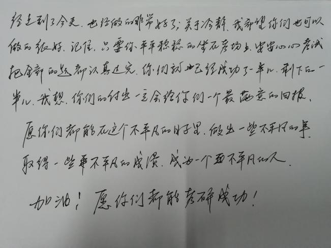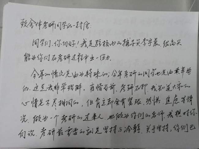 在考研前夕,他担心学生受到疫情的影响,可能会忐忑不安,没有办法安心复习。于是,他决心尽全力为考研的同学提供保障,免除大家的后顾之忧。他为学院众多考研的同学打印了准考证、考场信息表与承诺书,并连夜手写了一封“致全体考研学生的一封信”,希望大家不要受到疫情的影响,沉着应对,要充分发挥自己的实力;鼓励大家要认真对待考试,冷静分析,不要让自己长时间的努力付之一炬。在带领考生走进、走出考场的过程中,更是积极与他们交流心得,以此来缓解她们的压力。