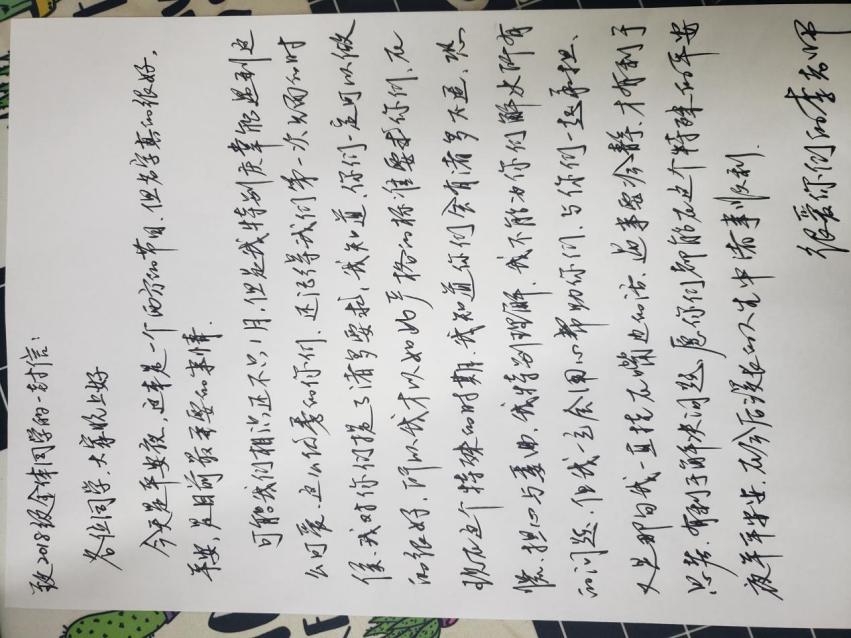 李宇晨手写的“致2018级全体同学的一封信”及学生的反馈