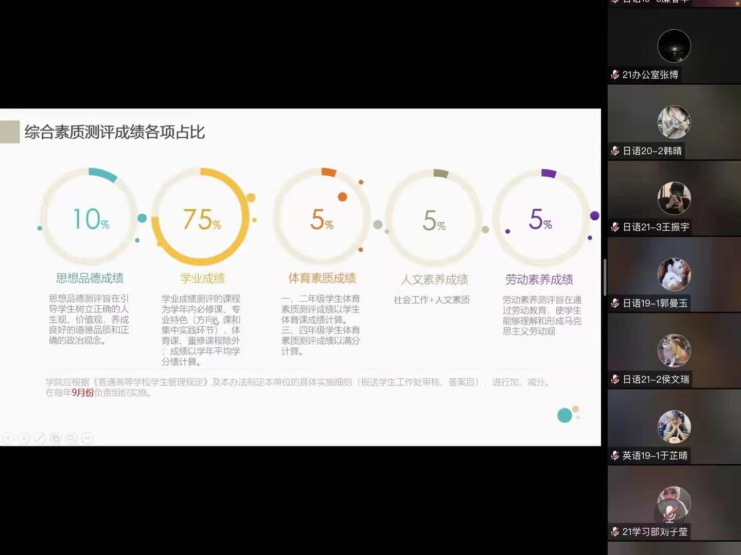 张锦对《大连海洋大学学生手册(2021版)》中“本科生综合素质测评办法”一章进行了细致地讲解,解读了综合素质测评成绩的构成内容,讲授了计算方法,强调了成绩上限、获奖加分截止时间等注意事项,明确了有效获奖材料的样式与准备方法,并与其他学生干部互动答疑。
