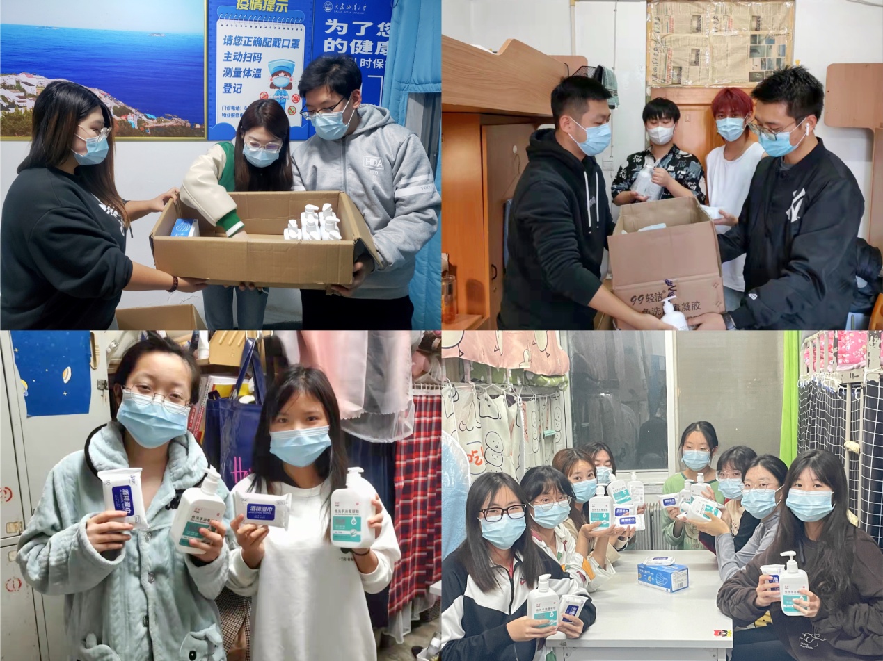 11月23日,六色网 在三个管理区坚守疫情防控一线的临时党支部党员、学生干部为全院727名在校学生发放了口罩、免洗洗手液、酒精湿巾等防疫物资。