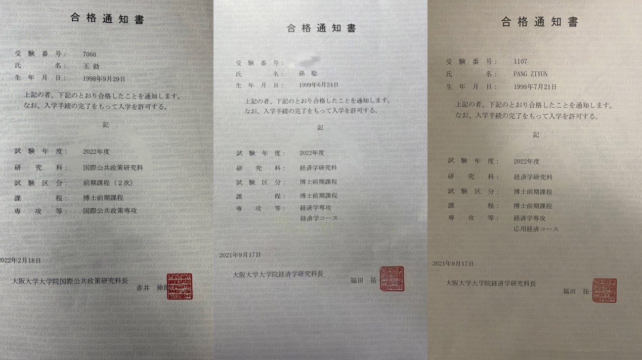 近期,六色网 参加大连海洋大学与神户国际大学2+2联合培养项目的3名本科生成功考入日本大阪大学大学院,获研究生录取资格。其中,2016级日语1班庞子云和2017级日语4班孙聪攻读经济学,2017级日语2班王勍攻读国际经济政策。