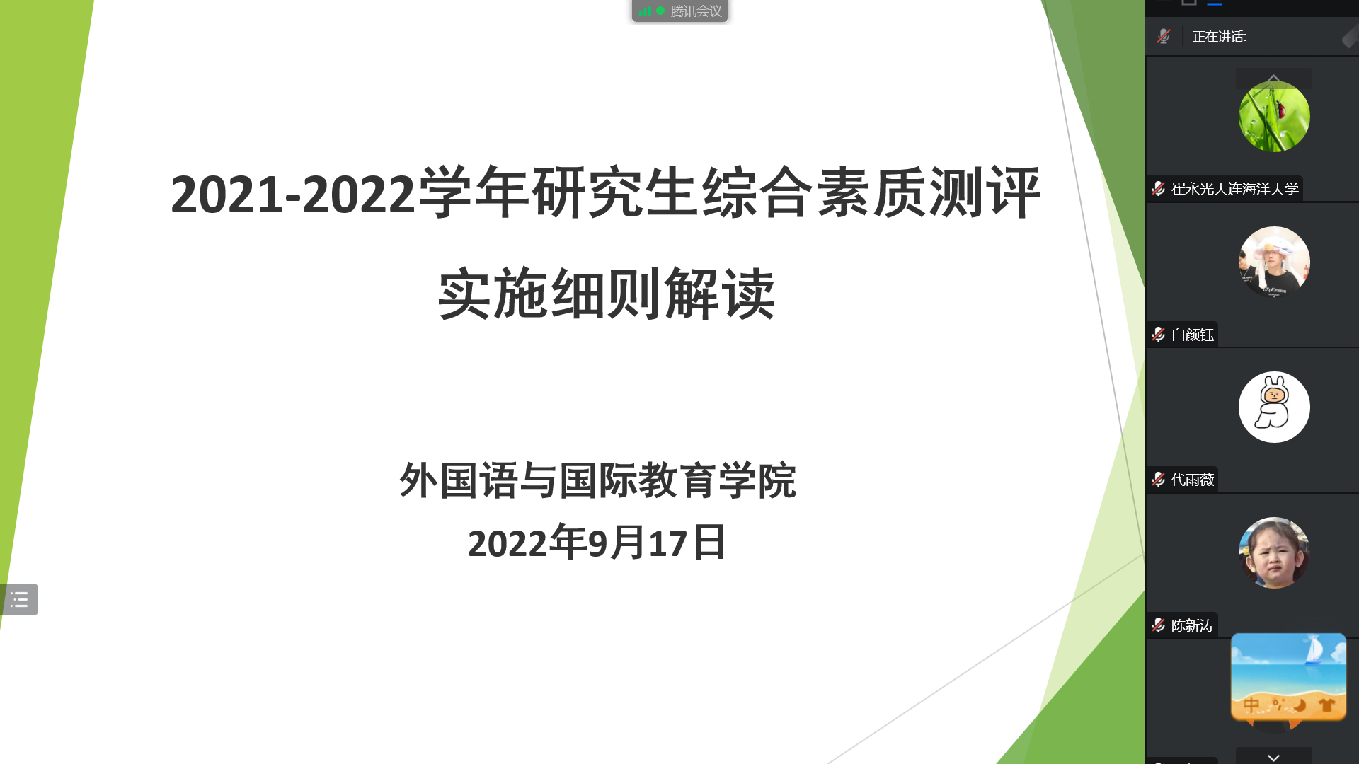 召开了综合素质测评实施细则说明会。学院副院长王倩、副书记兼纪检委员崔永光、2021级和2020级英日语笔译全体全日制研究生参加说明会。会议由崔永光主持。