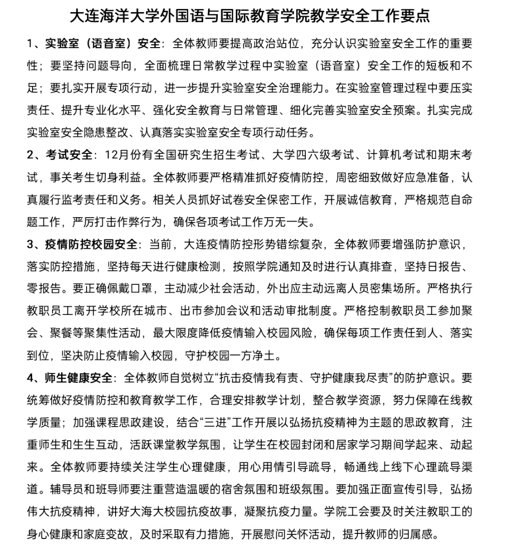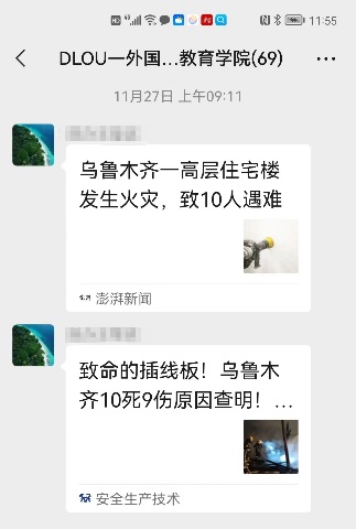 11月29日,学院工会主席崔永光向全体教师进行了安全教育。他对学院教学安全工作要点进行了梳理强调;组织教师观看了消防安全教育视频,视频取材于全国真实火灾案例,突出强化了火灾防范这一主题。此外,学院安全管理工作人员在学院微信群及时转发近期国内火灾事故教育资料,要求全体教师对安阳“11·21”等火灾事故教训举一反三、警钟长鸣,进一步增强责任感、紧迫感,严格遵守消防安全各项规章制度,坚决防范火灾事故发生,确保生命财产安全。