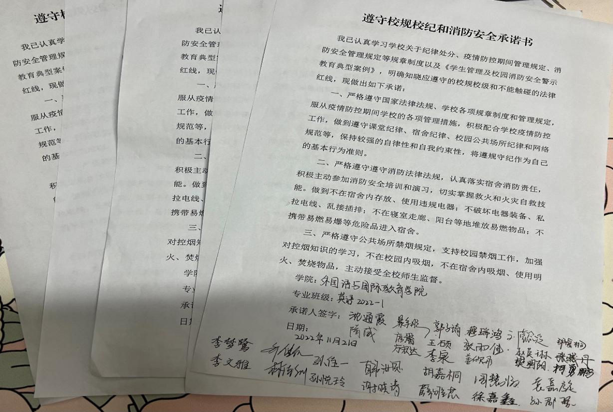 11月23日,学院组织全院本科学生开展消防安全教育系列活动。本次活动以班级为单位,通过校园消防安全线上答题、消防安全主题班会、消防规章制度学习、观看消防安全讲座、签订《遵守校规校纪和消防安全承诺书》等形式,在全院范围内向学生广泛宣传,普及消防知识。