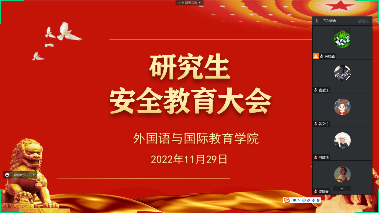 11月29日,学院召开了研究生消防安全教育大会,学院纪委书记黄桂峰、兼职辅导员程煦及全体2020-2022级研究生123人参会。会上,黄桂峰传达了学校关于安全工作的具体要求,强调要注意宿舍用电安全,及时排查安全隐患;同时对校外走读学生提出了安全方面的要求。