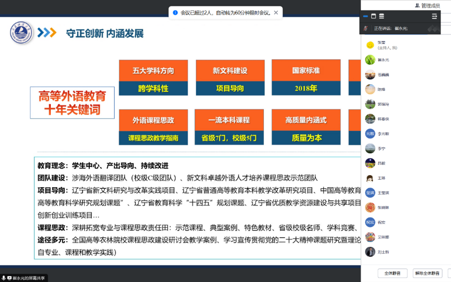 首先,专业负责人崔永光带领教师集中学习了教育部印发的《高等学校课程思政建设指导纲要》、辽宁省教育厅印发的《关于进一步深化本科教学改革全面提高人才培养质量的实施意见》等相关通知文件。随后,崔永光从课程建设、课程思政、特色教材、教改项目、师资队伍、教学竞赛、大创项目、学生获奖、师资培训等九个方面梳理了2023年英语省级一流本科专业建设成果与成效,同时指出了专业建设在质量内涵与专业特色、改革意识与教学能力、质量监控与保障机制等方面存在的问题与短板。最后,他要求教师以开展课程目标达成工作为契机,重视课程教学设计,提升课程建设能力,为专业内涵建设贡献力量。