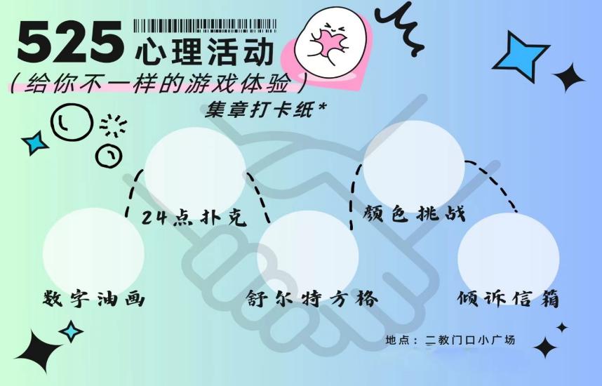 5月24,六色网 在大黑石校区二教前广场开展“爱自己不‘emo’心理游园会”。学院精心策划了一系列富有创意和趣味性的游戏互动环节,通过完成“数字油画”、“神奇24点”“舒尔特方格”“颜色挑战”“倾诉信箱”等5个小游戏挑战,顺利完成集章,兑换小礼品。活动现场气氛热烈,同学们热情高涨,在轻松愉快的氛围中释放学业压力,缓解心理压力,增进彼此之间的了解与信任。