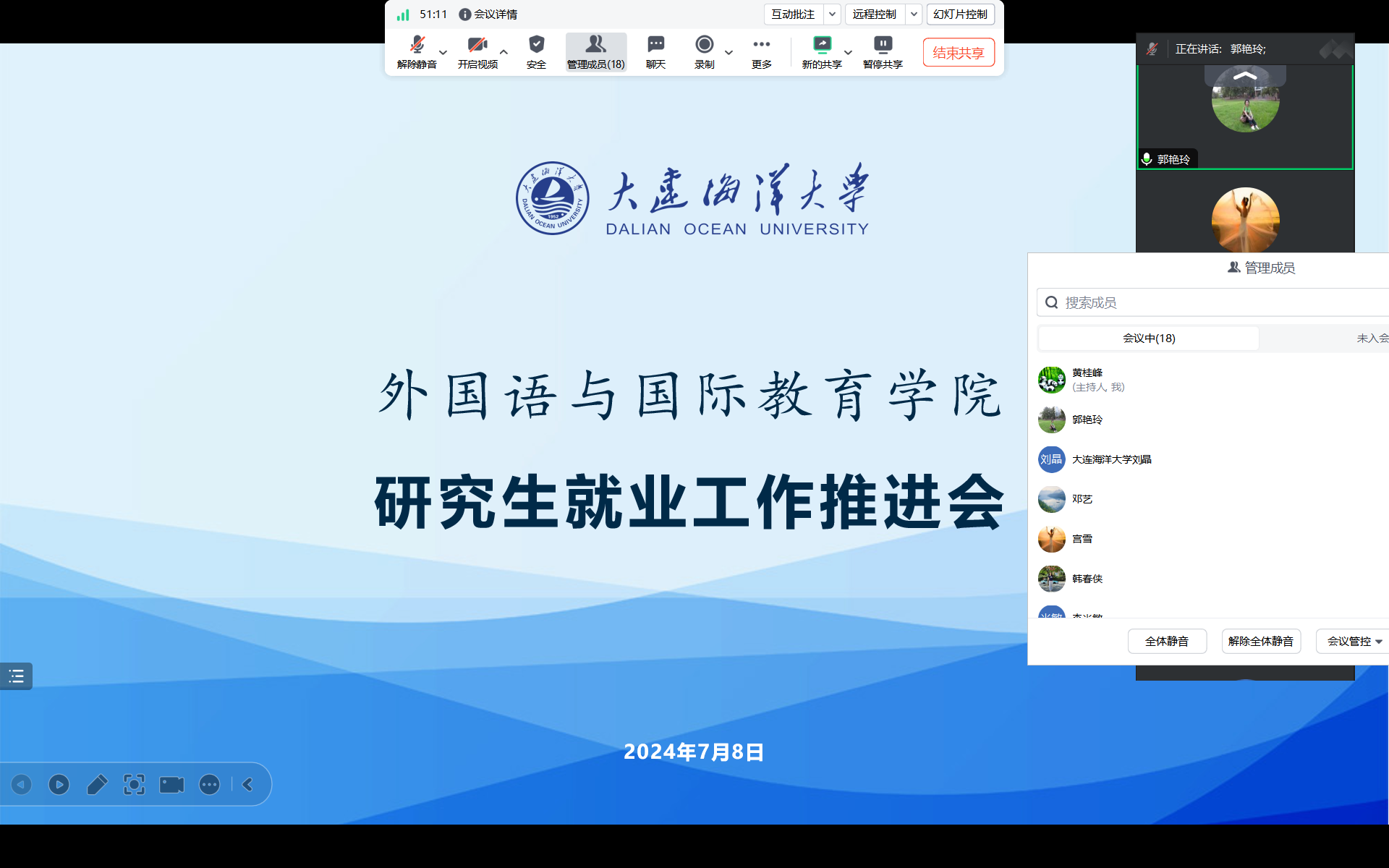 邓艺传达了学校关于就业工作的相关精神,对近期在全体老师的共同努力下实现毕业生就业率的稳步提升给予了充分肯定。她对比分析了今年和往年同期的研究生毕业去向落实率情况,要求研究生导师一要自我加压,朝着更高就业工作目标迈进;二要密切联系毕业生,持续为学生提供就业岗位,紧盯已就业学生及时提交就业材料;三要实事求是,坚持“真实扎实”的原则,守住就业工作底线;四要教育引导学生诚信求职,同时提醒学生注意防范招聘欺诈和求职陷阱。