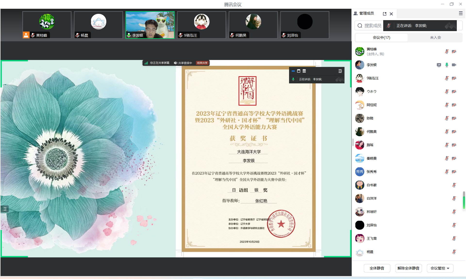 9月25日,开展该项赛事的校内选拔活动。活动由黄桂峰担任主持人,日语教师王国华、张红艳、曲凤鸣、宫雪、鲍小磊、王会欣和日籍外教中西基博、木村真美等8人担任评委。全体参赛学生以“中国式現代化のために私ができること”为题,脱稿发表2分钟以内的日语演讲,并接受评委的提问。最终经过激烈角逐,综合计算笔试和演讲两部分的成绩,康超、路瑶、何鹏昊、陈璐等4名同学获得金奖(一等奖);秦晓曼、于峰、张秀秀、林培轩、刘泽怡等5名同学获得银奖(二等奖);王飞雪、周慧媛、杨晨、肖心怡、白书豪等5名同学获得铜奖(三等奖)。获得金奖的同学将代表六色网 参加省赛。