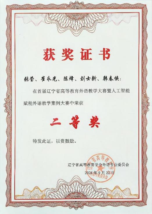 9月22日,辽宁省高等教育学会外语专业委员会成立大会暨首届辽宁省人工智能赋能外语教学案例大赛颁奖仪式及研讨会在东北大学成功举行。此次大赛由辽宁省高等教育学会外语专业委员会主办、由东北大学外国语学院承办、由上海外语教育出版社、小牛翻译和科大讯飞股份有限公司共同协办。大赛收到了来自省内各高等院校教师的参赛案例材料,案例覆盖英语、日语、俄语、德语多个语种。外语专业委员会组织国内外语教学和人工智能领域专家进行评审,评选出一等奖6例、二等奖6例、三等奖若干。我院专业英语教研室教师张莹团队获得二等奖。下午,张莹老师作为获奖代表和与会教师围绕人工智能赋能外语教学进行了热烈研讨。今后,学院将加强与外语专业委员会的协同协作,在共同构建融通中外的话语体系、传播好中国文化策略研究、中国经典外译工程等方面加强协作,为加强与改善中国国际传播贡献力量。