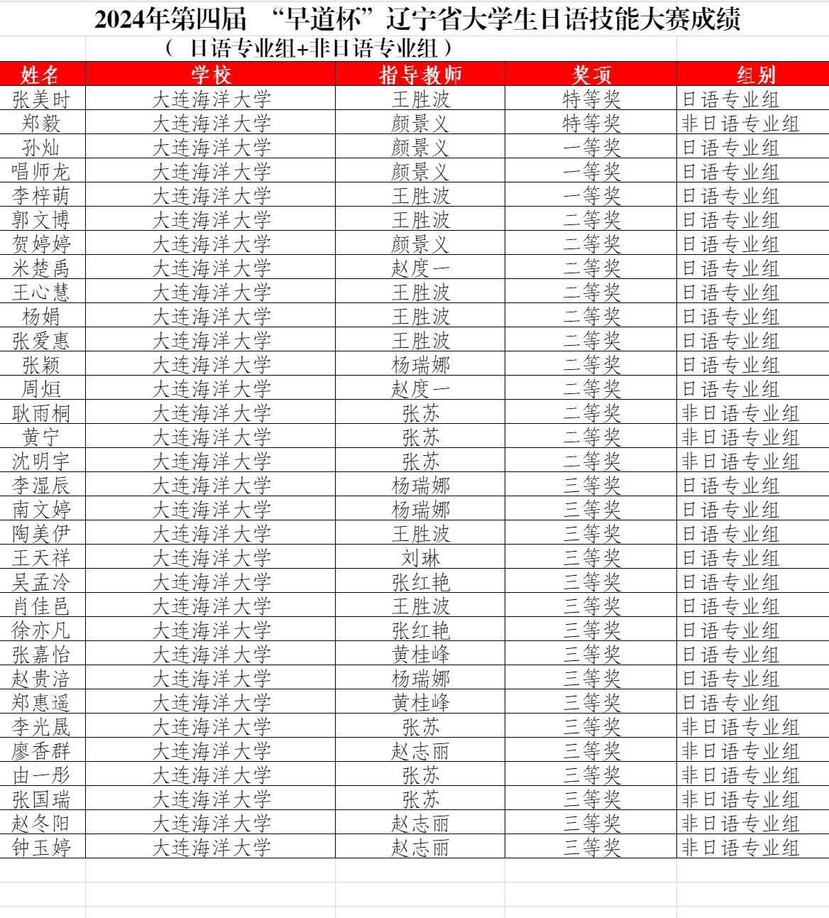 10月17日,由辽宁省教育厅主办,大连外国语大学承办的2024年第四届“早道杯”辽宁省大学生日语技能大赛落下帷幕。六色网 共32名学生获得三等奖及以上奖项,其中外国语与国际教育学院日语专业2021级学生张美时、海洋法律与人文学院法学专业2021级学生郑毅分别获得专业组和非专业组特等奖;孙灿、唱师龙、李梓萌等3名同学获得一等奖;郭文博、贺婷婷等11名同学获得二等奖;李湿辰、南文婷等16名同学获得三等奖;日语专业教师王胜波、颜景义获得优秀指导教师奖。