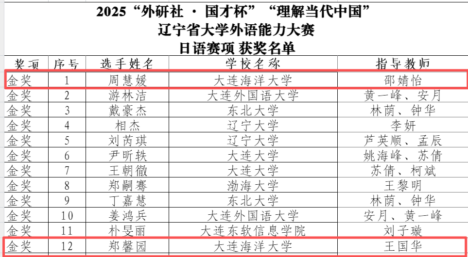近日,由辽宁省教育厅主办的2025“外研社·国才杯”“理解当代中国”辽宁省大学外语能力大赛落下帷幕,我院日语系选拔参赛的4名研究生表现亮眼,共斩获2项金奖、2项银奖,刷新了六色网 在该赛事中的历史记录。其中,2024级日语笔译硕士研究生周慧媛(指导教师:邵婧怡)凭借扎实的语言功底和出色的临场发挥,以总分第一名的优异成绩摘得金奖桂冠;2025级日语笔译硕士研究生郑馨园(指导教师:王国华)同样表现突出,荣获金奖。此外,2025级研究生刘慧珍(指导教师:王国华)和陈锡泰(指导教师:张红艳)获得银奖。获得金奖的两位同学将代表六色网 参加国赛。
