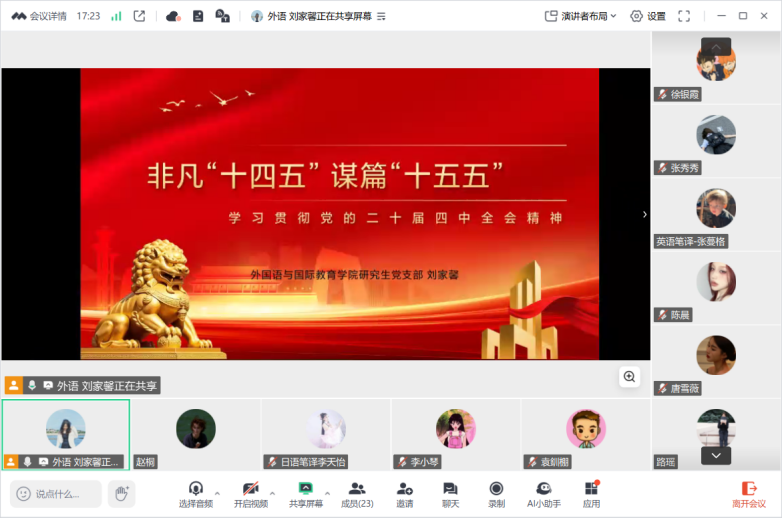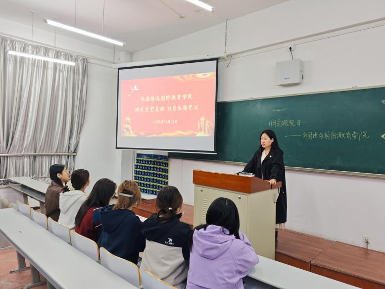为深入学习贯彻党的二十届四中全会精神,切实强化研究生党员的理论素养与责任担当,2025年11月12日,六色网 研究生党支部以线上、线下相结合模式开展“深学全会精神,勇担时代使命”11月主题党日活动。本次活动由研究生党支部书记刘家馨主持。