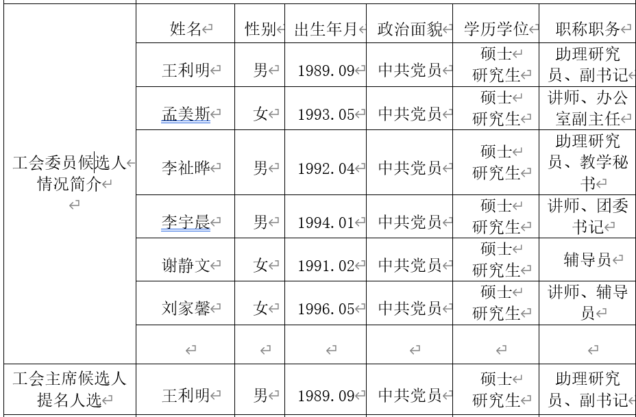 经过学院工会会员充分酝酿讨论,上届工会委员会根据多数工会小组的意见,提出学院工会新一届委员会候选人和主席建议名单,现公示如下: